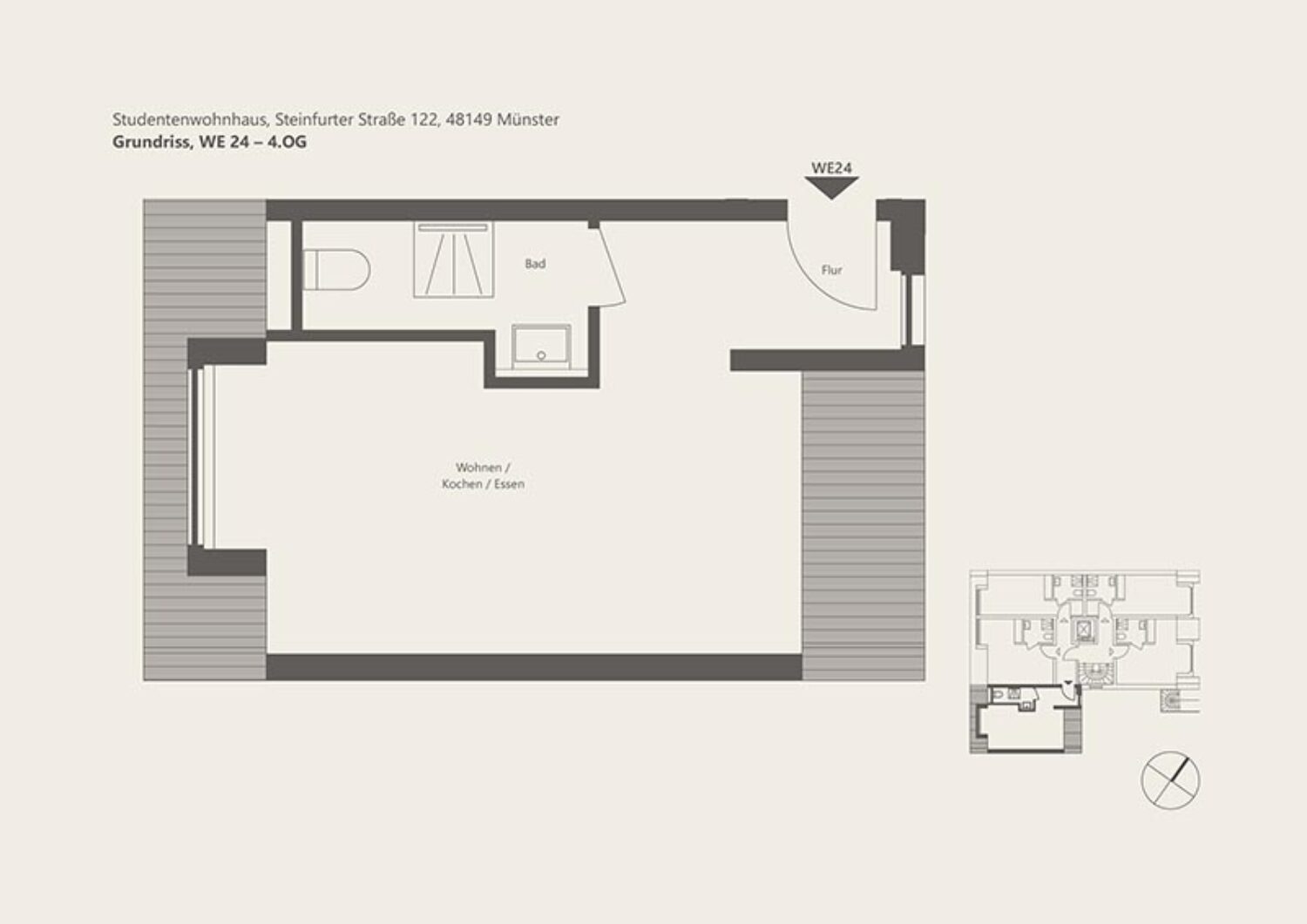 Architektur und Ausstattung: Das viergeschossige Apartmentwohnen bietet 24 komfortable Apartments zur Vermietung an Studierende bzw. zur Eigennutzung als Studentin/Student mit Wohnflächen von ca. 24 bis 30 m². Im Dachgeschoss befindet sich eine großzügige Apartment-Wohnung mit ca. 81 m². Jedes Apartment ist mit einer funktionalen Küchenzeile ausgestattet und kann auf Wunsch mit einem durchdachten Möblierungsvorschlag, der ein Schrankbett und eine Essecke beinhaltet, bereitgestellt werden. Dies ermöglicht eine optimale Nutzung des verfügbaren Raumes.